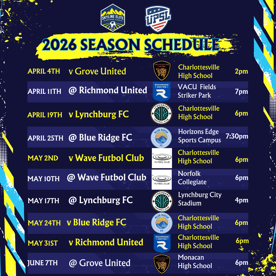 Skyline UPSL will compete in the Premier Division of the UPSL within the Virginia South Conference. Opponents include clubs based out of Roanoke, Harrisonburg, Lynchburg, Richmond, and the Tidewater area. Regular season league play begins in April and extends until June with postseason play beginning in June and possible National Championship play in July.